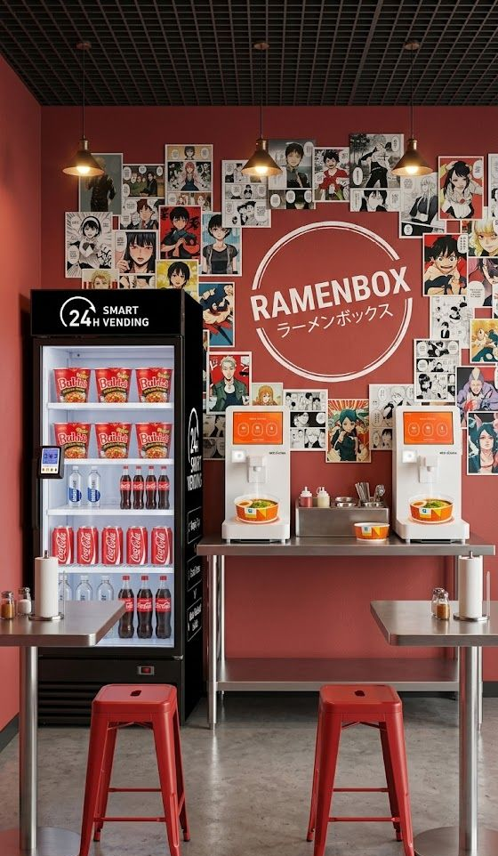 The most accessible entry into the booming Asian-fusion market. Traditional restaurants cost hundreds of thousands to build. RamenBox changes the game by combining automation with the comfort of a modern café — all for a fraction of the cost.